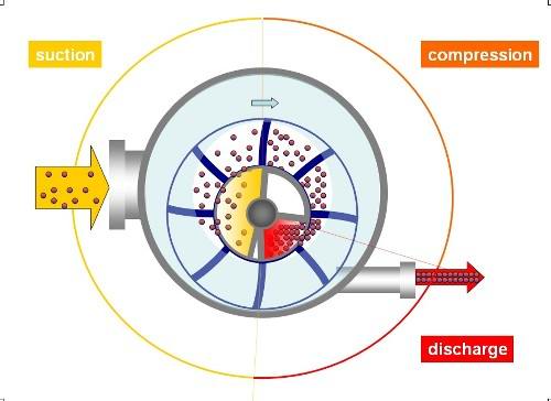 По мере того, как вращаемая жидкость поступает в расширенную часть корпуса,  полость замещается газом. Расширенная часть корпуса накапливает жидкость для сжатия в полости ротора. Поскольку ротор вращается, создается эффект подобный поршню, этот цикл происходит во время каждого оборота ротора. По мере вращения ротора на 360 градусов, вращаемая жидкость перемещается из области  расширения корпуса в полость ротора в направлении корпуса. После этого выдавленный газ сжимается в полости ротора и выходит через разгрузочное отверстие корпуса.